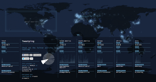 C’est un outil sympathique à découvrir : Tweetping permet de visualiser en temps-réel les tweets envoyés à travers le monde. Vous n’aurez sans doute pas le temps de les lire, mais chaque message publié sur le réseau social et géolocalisé permet d’ajouter un point lumineux sur la carte. Ainsi, en quelques minutes, on visualise très bien les zones à partir desquelles des tweets sont envoyés.