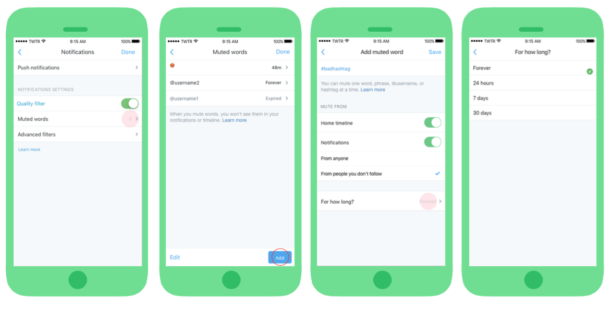 Autre nouveauté : l’amélioration de la fonction Mute qui permet de masquer automatiquement certains tweets. Auparavant réservée aux notifications, elle est désormais étendue au fil d’actualité. Vous pouvez donc masquer des tweets en fonction de mots clés ou d’expressions. Vous choisissez aussi la durée pendant laquelle ces filtres sont activés : 1 journée, 1 semaine, 1 mois ou pour toujours.