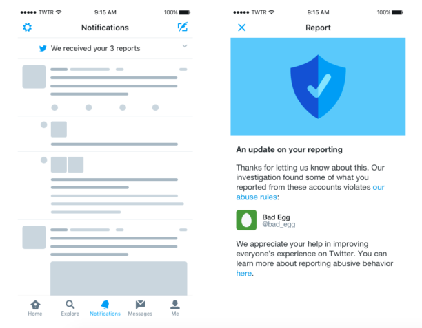 Sur Twitter, vous serez directement informé du suivi de vos signalements. Quel que soit la raison du report, vous pourrez suivre votre « dossier » facilement, sans quitter Twitter. Vous saurez quand votre signalement a été reçu par les équipes de Twitter, quand il a été traité et quelles mesures ont été prises pour vous protéger. Ces informations seront rassemblées dans l’onglet Notifications.