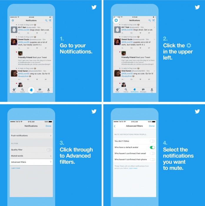 Twitter propose 4 nouveaux filtres pour les notifications. Accédez à vos notifications, appuyez sur la petite roue dentée en haut à gauche, puis sur « Filtres avancés ». Vous pourrez alors décider de ne plus recevoir de tweets des comptes :