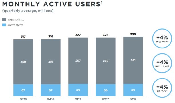 Du côté de l’usage, le réseau social a remarqué des erreurs dans la comptabilisation du nombre d’utilisateurs (depuis fin 2016). Ainsi, il n’y avait pas 328 mais 326 millions d’utilisateurs actifs mensuel au second trimestre 2017. Le réseau social a gagné 4 millions de MAU au troisième trimestre, pour atteindre les 330 millions. La croissance est très faible, +4% sur un an.