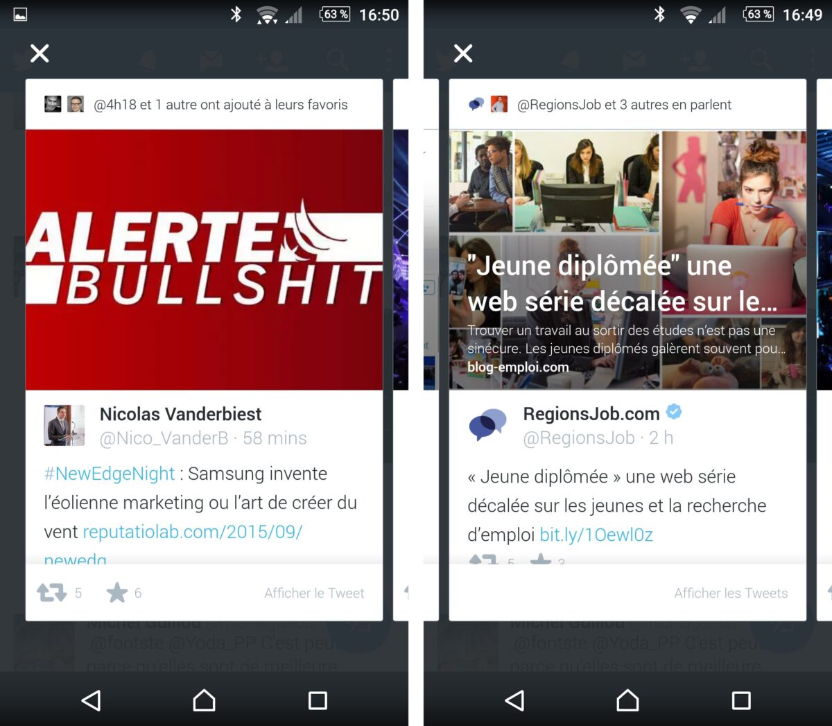 Cette nouvelle fonctionnalité, Temps Forts, permet d’accéder aux contenus les plus intéressants. Visuellement, c’est très réussi. Chaque tweet est affiché sous forme de carte, et les données Twitter Cards sont récupérées automatiquement pour les liens qui en contiennent. Le réseau social indique les utilisateurs qui ont RT ce tweet ou qui l’ont ajouté à leurs favoris. Un swipe suffit pour passer au tweet suivant. Une quinzaine de tweets sont sélectionnés, on peut donc rapidement les visualiser. Si vous avez activé cette fonctionnalité, vous recevrez aussi des notifications régulières quand un tweet intéressant aura été repéré. Si cela fonctionne aussi bien que Magic Recs, c’est vraiment prometteur.