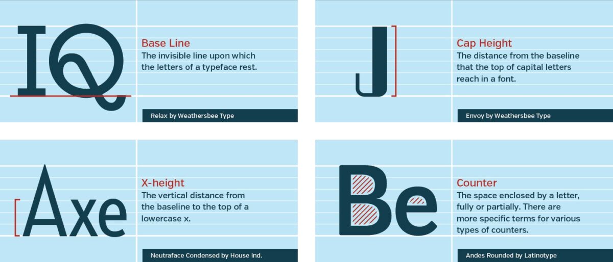 Pour aller plus loin (et en français), vous pouvez vous reporter à ce schéma qui répertorie les principaux à termes à connaître pour définir une police de caractères.