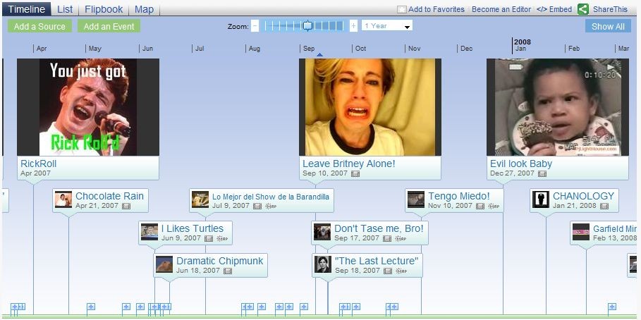 Je vous avais déjà parlé des Internet memes, ces phénomènes qui se répandent à vitesse grand V sur le net au point de devenir rapidement des classiques. Les vidéos en sont un support priviligié, Youtube y participe pleinement. Dipity, qui propose de classer les vidéos du célèbre site de partage de vidéos en ordre chronologique, propose une adaptation de sa frise à ces vidéos virales. Il y ajoute même texte et photos. Une bonne manière de voir ou revoir ces buzzs. On y trouve de tout : du Download day de Firefox 3 au premier smiley en passant par Leave Britney Alone, Rick rolled ou encore Gunthër. Les internautes sont libres de faire leurs propositions. A déguster sans modération !