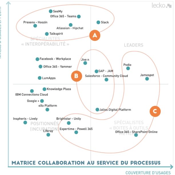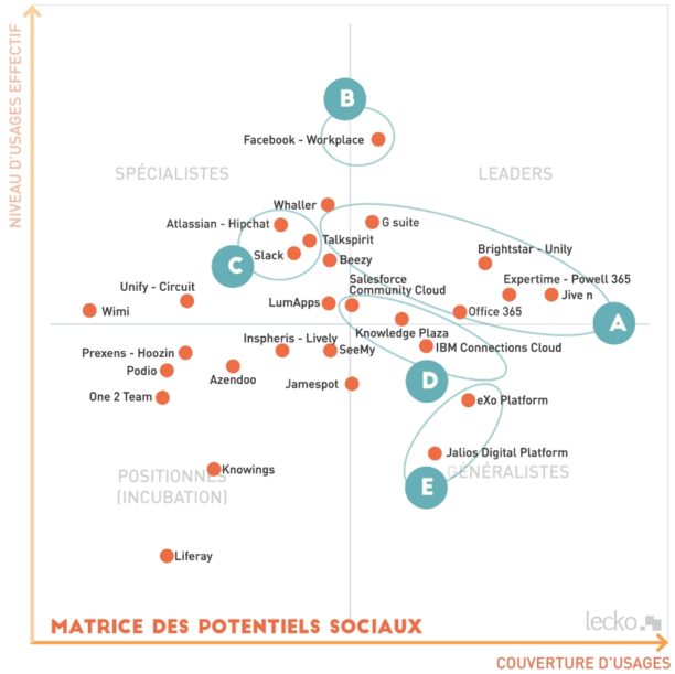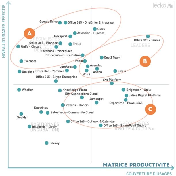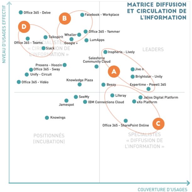 On peut classer les outils selon plusieurs familles : ceux qui servent la diffusion et la circulation de l’information tels que Jive et Slack, ceux qui vont plutôt structurer l’information et gérer les connaissances comme Google+ et One Drive, ceux qui favorisent la productivité tels que Facebook Workplace ou Evernote et enfin ceux qui misent tout sur la collaboration comme SeeMy ou Prexens. Les cinq matrices ci-dessous permettent de cartographier l’écosystème des RSE.
