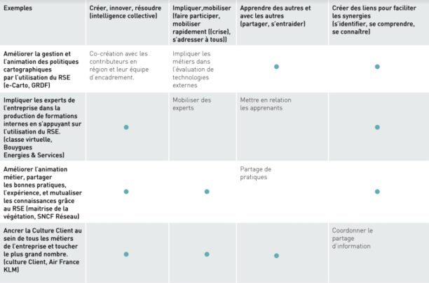 Pour mieux collaborer entre salariés d’une même entreprise, il faut actionner de nouveaux leviers afin de faire le tri de l’information et gérer la multitude des activités et des interlocuteurs. Il existe 4 composantes à exploiter pour augmenter l’efficacité de son activité : mettre en réseau son environnement afin d’impliquer tous les collaborateurs pour créer, innover et résoudre des problématiques (intelligence collective), impliquer et mobiliser les métiers en cas de crise par exemple, apprendre des autres (partager, s’entraider) et enfin créer des liens pour faciliter les synergies.