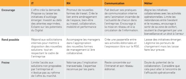 Pour transformer une organisation sur la durée, il faut créer les conditions adéquates de gouvernance, afin d’aligner les actions avec les besoins stratégiques de l’entreprise. Pour cela, l’interdépendance entre les différents pôles d’une entreprise est très forte : l’IT peut faciliter la mise à disposition de solutions nouvelles ou se replier sur son cadre technique, les RH peuvent impulser un travailler autrement ou garder la tête plongée dans le réglementaire, la Communication peut encourager la mise en réseau ou défendre sa maîtrise de l’information, les autres « métiers » peuvent repenser leur activité avec l’aide de la collaboration ou batailler sur une optimisation vaine de l’existant.