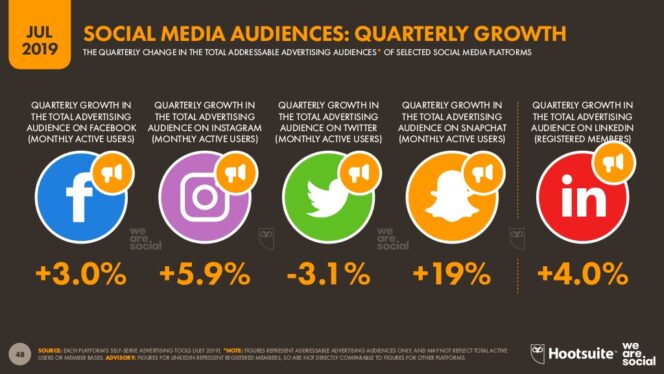Le rapport note que l’audience publicitaire de Snapchat a bondi de 19% au cours des trois derniers mois, atteignant un total de 369 millions d’utilisateurs en juillet 2019. C’est la plus grosse progression concernant l’audience publicitaire dans les réseaux sociaux. La croissance d’Instagram est de 5,9%, celle de Facebook 3% et LinkedIn 4%. Seul Twitter est en perte de vitesse avec -3,1%.