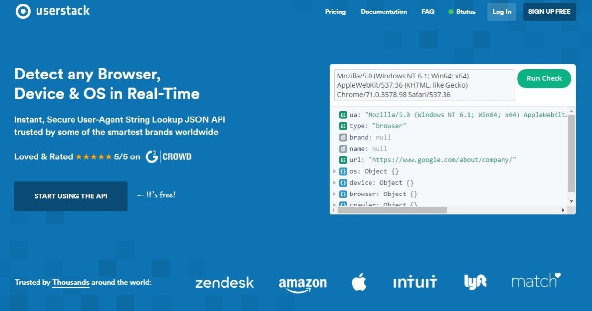 Userstack offre une interface API REST en temps réel et très simple d’utilisation. L’outil analyse les chaînes de l’user-agent avec précision et vous donne ainsi accès à de nombreuses données telles que le navigateur, le système d’exploitation et même le périphérique utilisé par les visiteurs de votre site web.