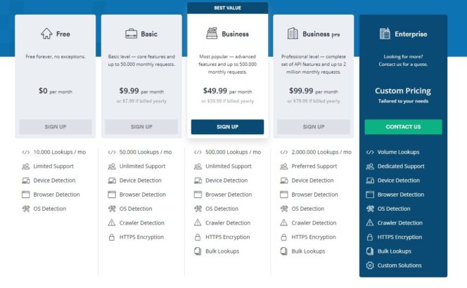 Userstack propose des plans adaptés à tous les budgets. Vous pouvez commencer par utiliser le service gratuitement et ce jusqu’à 10 000 demandes user-agent par mois. Ce plan vous permettra également de détecter les appareils, navigateurs et systèmes d’exploitation de vos visiteurs. Pour effectuer 50 000 demandes et avoir de plus amples informations comme le cryptage HTTPS ou la détection de robots, comptez 9,99$ par mois uniquement pour le plan basic. Le plan « business » à 49,99$ vous donnera accès à plus de 500 000 demandes mensuelles et à la recherche globale. Enfin, pour effectuer plus de 2 millions de demandes par mois vous devrez dépenser 99,99 dollars. Des plans sur mesure sont aussi disponibles pour les groupes qui souhaitent gérer plusieurs millions de demandes mensuelles.