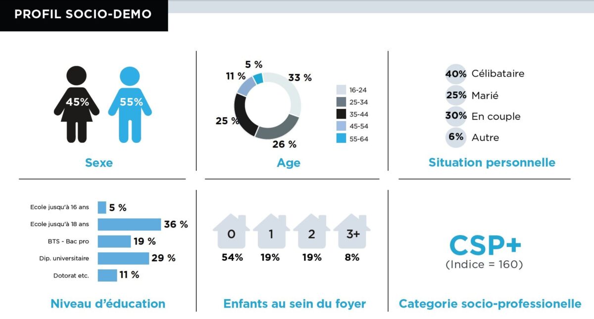 - les utilisateurs français sont des hommes à 55% et des femmes à 45%