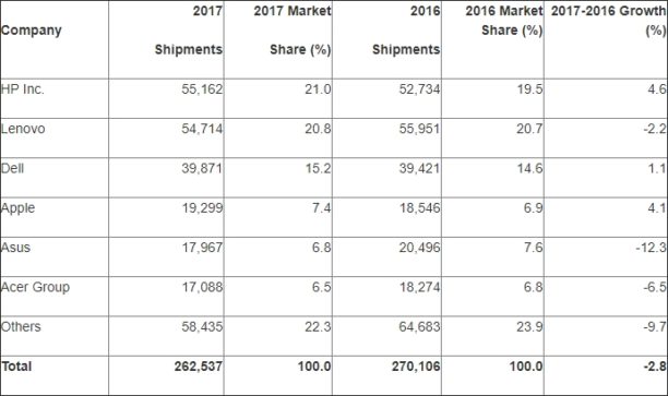 Ce tableau montre le nombre d’ordinateurs vendus en 2017 et les différentes parts de marché des constructeurs. En 2017, il s’est vendu 2,8% d’ordinateurs de moins qu’en 2016. Le marché se contracte pour la sixième année consécutive.