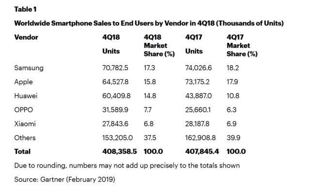 Les ventes mondiales de smartphones ralentissent. Au quatrième trimestre de 2018, 408,4 millions d’unités ont été vendues, soit une croissance de seulement 0,1% par rapport au quatrième trimestre de 2017, selon le rapport publié par Gartner.