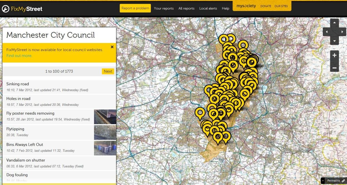 Transparence politique locale : Fixmystreet. Vous rêvez de dénoncer un non ramassage de vos poubelles, une détérioration ou une rue bardée de nids de poules. Fixmystreet vous permet, grâce à votre Smartphone, de signaler l’incident en entrant le nom de la rue, puis de le localiser précisément sur la carte proposée, et de joindre une photo si vous le souhaitez. Fixmastreet s’occupe d’envoyer l’incident aux services de la ville en votre nom.