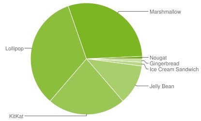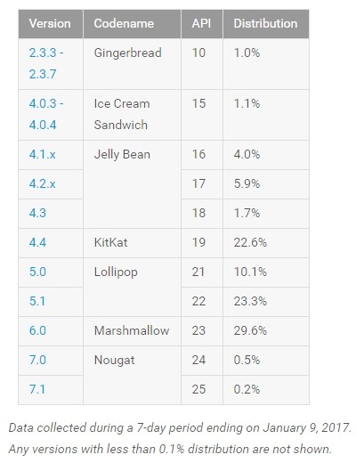 Le système d’exploitation mobile de Google, Android, est parfois critiqué. Certains smartphones embarquent Android Nougat, d’autres Marshmallow, beaucoup sont restés à Lollipop ou Kitkat, voire Jelly Bean, Ice Cream Sandwich et même Gingerbread. Pour mieux comprendre l’état des lieux actuel des distributions d’Android, Google publie régulièrement des statistiques. Voici la part de marché de chaque version d’Android (chiffres mis à jour en janvier 2017).