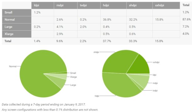 Google fournit également quelques informations sur les tailles d’écrans les plus populaires sur Android, ainsi que sur les densités de pixels observées. Les densités sont classées de ldpi (low ~ 120dpi) à xxxhdpi (extra-extra-extra-high (sic) ~ 640 dpi), les écrans sont classés de small screens (minimum 426x320dp) à xlarge screens (minimum 960x720dp). On obtient les résultats suivants.