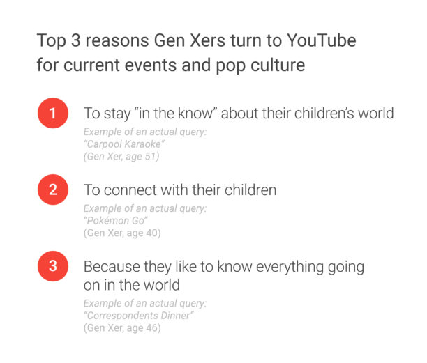 « La génération X s’est adaptée rapidement à de nombreuses innovations technologiques révolutionnaires qui ont accéléré l’accès à l’information, au divertissement et aux échanges : magnétoscopes, CD, lecteurs MP3-MP4, téléphones portables, etc. Et ils ont été les premiers à adopter les médias sociaux à grande échelle. Rester à la pointe de ce qui se fait et ne pas se sentir dépassé est important pour leur identité, il est donc logique qu’ils se tournent vers YouTube pour garder un œil sur les événements actuels » explique Justine Bloome.