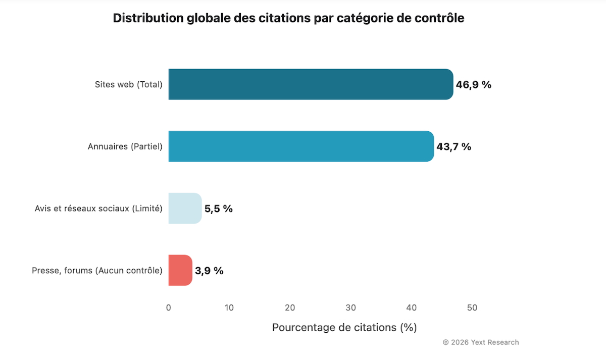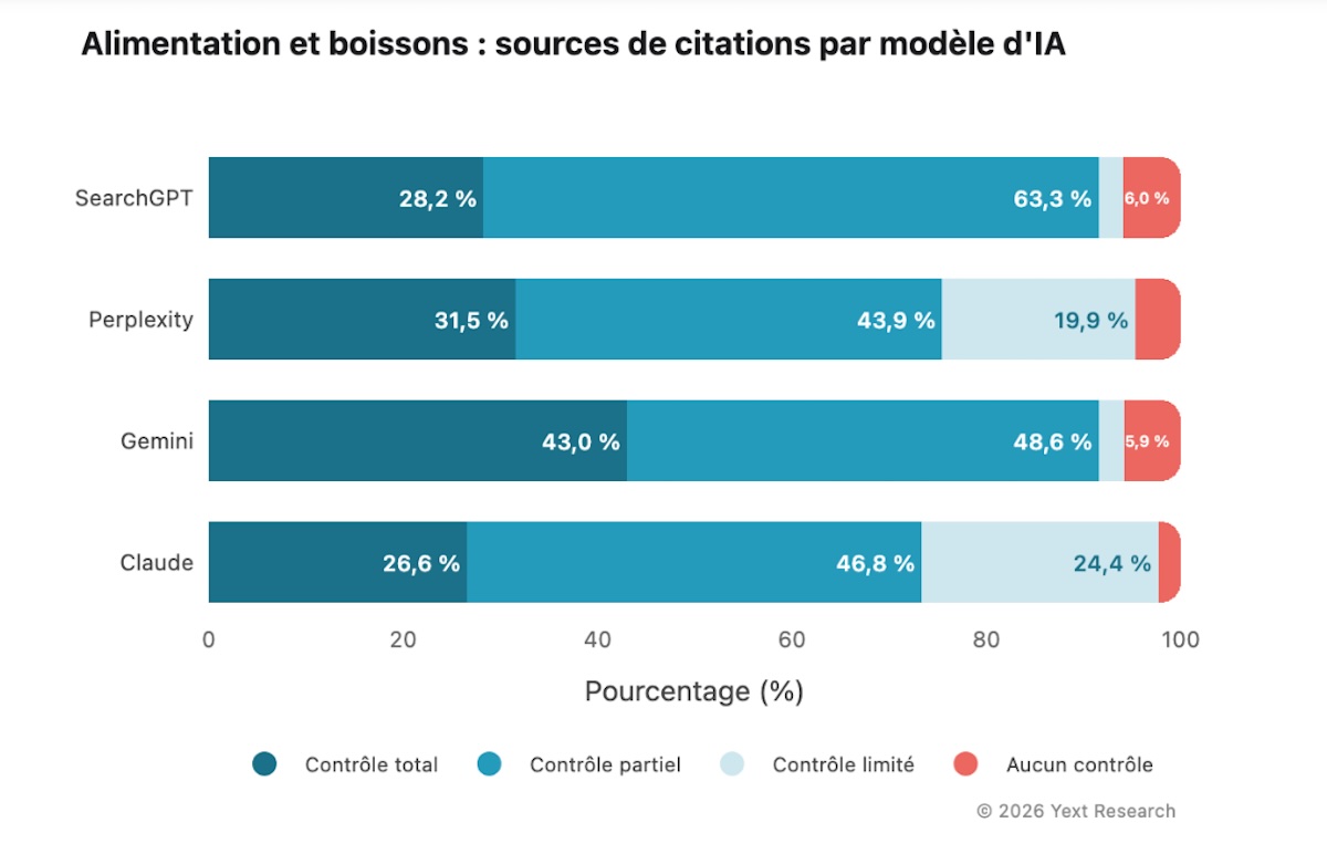 L’analyse porte sur 17,2 millions de citations générées au quatrième trimestre 2025 par quatre modèles : Gemini, Claude, SearchGPT (ChatGPT) et Perplexity. Pour mesurer les écarts, Yext classe chaque source citée selon le degré de contrôle qu’une marque exerce dessus.