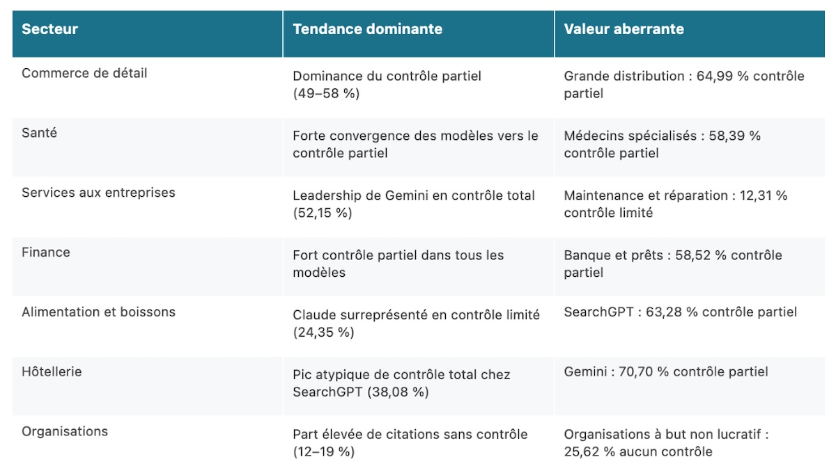 Claude se distingue par un recours nettement plus élevé aux contenus générés par les utilisateurs (catégorie « Limité »). Dans le secteur de l’alimentation et des boissons, cette part atteint 24,35 %, contre 2,57 % pour Gemini. « Les citations relevant de la catégorie « Contrôle limité » sont présentes à des niveaux deux à quatre fois supérieurs à ceux observés pour les autres modèles », souligne l’étude, concernant Claude. Yext avance une hypothèse liée à l’IA constitutionnelle d’Anthropic, dont les principes pourraient accorder davantage de poids à des sources diverses validées par les utilisateurs et utilisatrices comme signaux de pertinence.