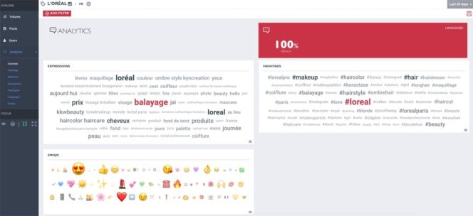 Autre gros avantage de Visibrain : la possibilité d’ajouter des filtres. Ces derniers permettent d’enlever le « bruit » et les posts de bots, mais aussi de trier les contenus. En ajoutant un filtre « Vegan » ou « cruauté » à la requête L’Oréal, on pourrait ainsi voir uniquement les posts négatifs sur la marque. Indispensable pour une veille pointue sur son e-réputation. Cette exhaustivité des résultats avec la capacité à faire remonter, et filtrer tous les posts est vraiment le gros point fort de l’outil.