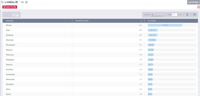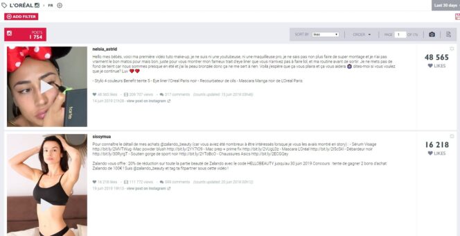 Visibrain permet aussi d’avoir une vision détaillée sur les posts contenant un hashtag ou un mot clé. Ici, nous pouvons classer les posts les plus likés, sur 30 jours, contenant le mot « L’Oréal ». Le fait de relever les mots inclus dans les posts permet de faire remonter n’importe quel contenu. Vous pouvez trier les contenus par nombre de likes, de commentaires, ou vues vidéo. Tout est exportable sous format CSV. Notons que chaque post est « cliquable », il vous suffit de cliquer pour être redirigé sur le post Instagram.