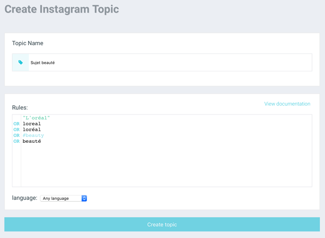 Premier point fort de Visibrain : la possibilité de faire une veille sur sa marque, sa réputation ou ses actions de communication ou ses concurrents. Contrairement à d’autres solutions, il n’est pas nécessaire de se loguer à votre compte Instagram, ou d’avoir un compte Business pour lancer votre veille. L’outil est indépendant de votre compte. Pour lancer une analyse Instagram, il suffit de choisir un sujet, un mot clé ou un hashtag. Contrairement à la plupart des outils Instagram, Visibrain est en effet capable de repérer des mots-clés dans les posts. Vous pouvez choisir plusieurs mots par recherche, et faire des filtres par langue. Là encore, c’est un gros avantage pour une veille efficace.
