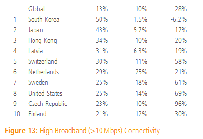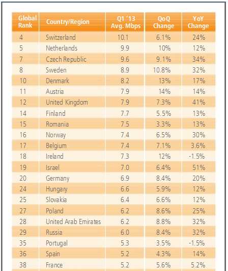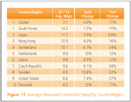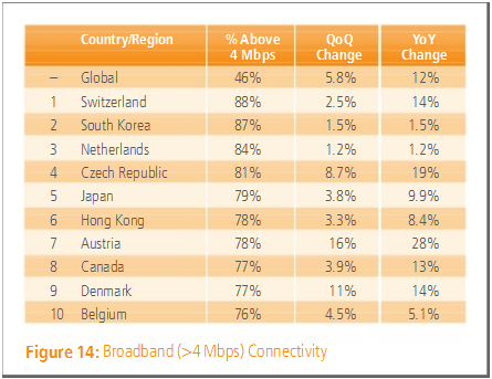 Le haut débit (4 Mbps et plus) concerne désormais 46% des connexions (en hausse de 5,8% sur le trimestre) et le très haut débit (10 Mbps et plus) est constaté sur 13% des connexions (+10% sur la période). Les pays où Internet est le plus rapide sont la Corée du Sud (14,2 Mbps), le Japon (11,7 Mbps) et Hong-Kong (10,9 Mbps).
