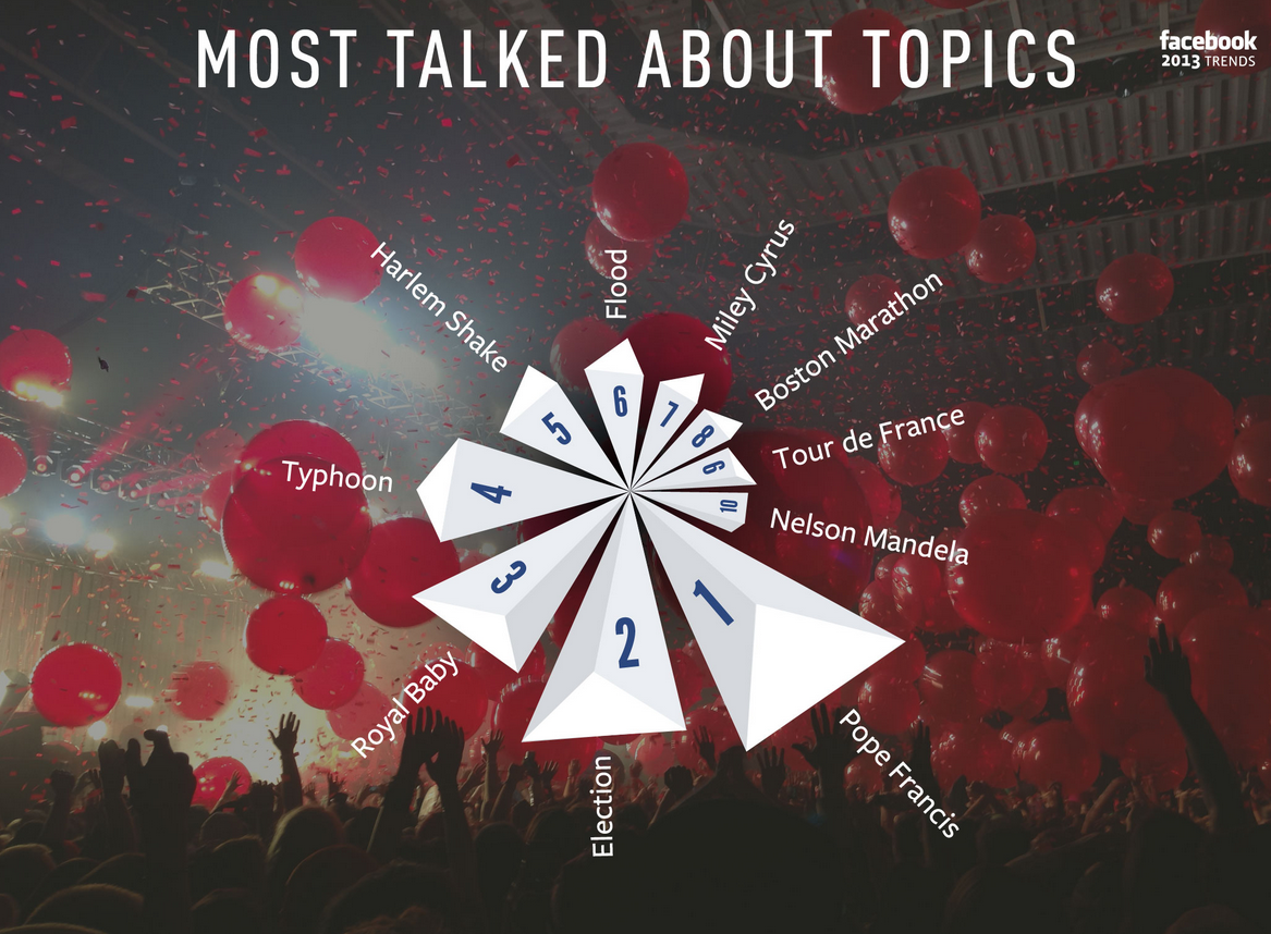 Les sujets les plus discutés sur Facebook, dans le monde entier, offrent un bon résumé de l’actualité internationale : le Pape François, Election, le Royal Baby, le Typhon et le Harlem Shake. Malgré sa mort très récente, Nelson Mandela fait quand même partie des sujets les plus discutés de l’année.