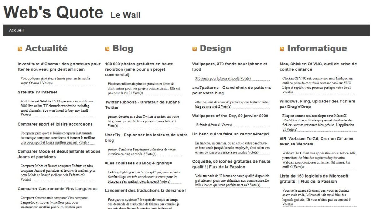 La force d’un digg-like repose sur sa communauté. Il ne tient qu’à vous de rejoindre celle-ci. N’hésitez pas à le tester pour vous faire votre avis ! Je termine avec une fonctionnalité vraiment sympa proposée par Web’s quote : le wall. Il permet d’apercevoir en un clin d’œil les derniers billets diffusés dans chaque catégorie.