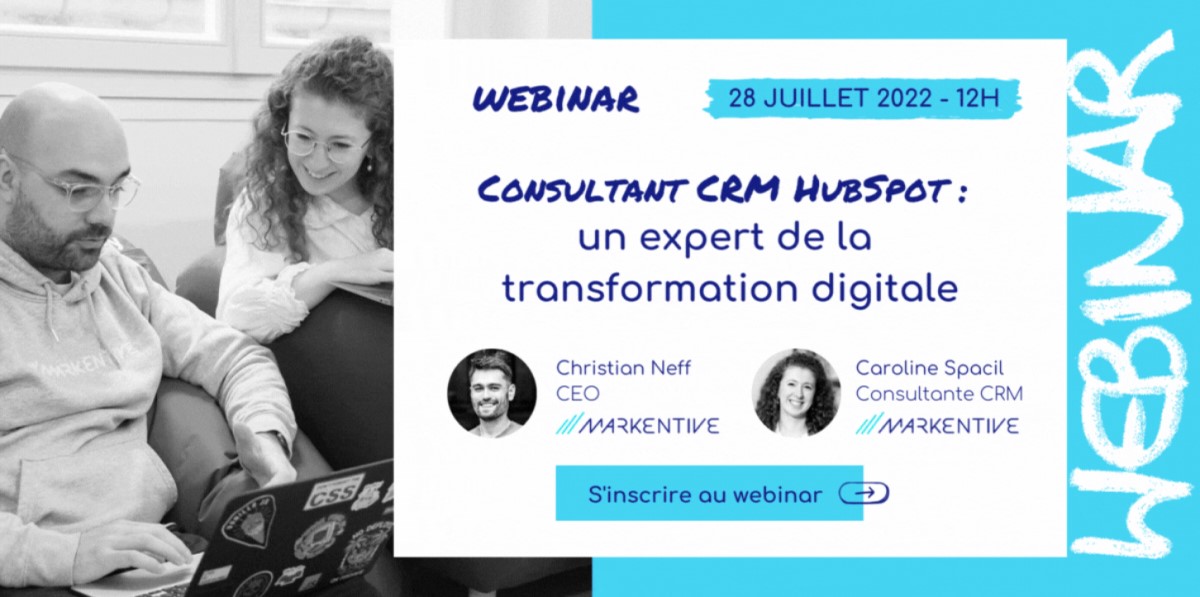 Vous souhaitez découvrir le métier de consultant CRM HubSpot ? Participez au prochain webinar organisé par Markentive jeudi 28 juillet à 12h, pour en apprendre plus sur ses missions et à quoi ressemble le quotidien de celles et ceux qui l’exercent.