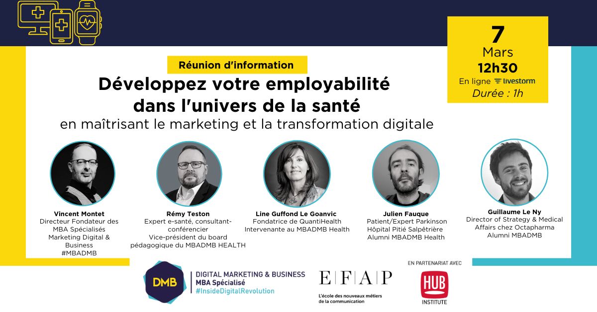 Vous souhaitez en savoir plus sur le panorama complet du secteur, connaître les principaux acteurs de l’écosystème digital de la santé et les opportunités d’emploi offertes dans ce secteur en pleine mutation ? Participez au prochain webinar organisé par l’EFAP et animé par des invités de premier plan :