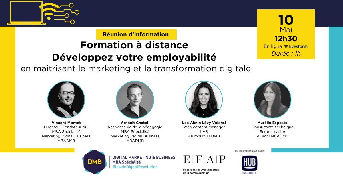 Vous êtes passionné par les métiers du marketing, de la communication et de la transformation digitale, et vous envisagez de vous orienter ou vous reconvertir dans ce domaine passionnant à la pointe de la technologie ? L’EFAP organise un webinar dédié pour vous fournir toutes les informations nécessaires afin de vous guider dans vos démarches, et ce quelle que soit votre zone géographique, grâce au MBA spécialisé Digital Marketing & Business (MBADMB).