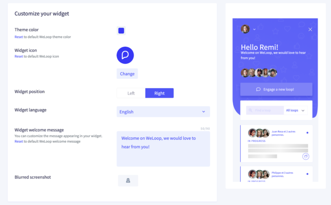 Pour intégrer WeLoop vous devez créer une équipe d’administrateurs qui pourront gérer l’outil avec vous. Dès que vous avez intégré le script, inscrit le nom de l’équipe et ajouté des collaborateurs, vous avez accès à un module permettant de personnaliser le widget et de choisir son emplacement sur l’écran. Il est notamment possible d’uploader votre logo, d’inscrire un message de bienvenue, de choisir une couleur d’arrière-plan parmi la palette proposée ou de rentrer le code web de la couleur de votre choix, afin qu’il s’accorde à votre charte graphique.