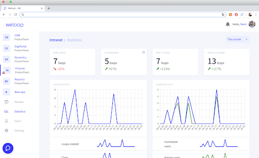 WeLoop met à votre disposition des statistiques sur l’engagement et la participation de vos utilisateurs. Vous pouvez ainsi voir les connexions de vos utilisateurs sur une période donnée, mais aussi savoir sur quels créneaux horaires ils sont le plus actifs lors des 1, 7, ou 30 derniers jours. L’outil permet également d’avoir une idée de la durée moyenne des sessions utilisateurs, de voir sur quelle période vous avez reçu le plus de commentaires, quels sont ceux que vous avez traités, qui sont en cours ou dont vous avez modifié le statut…