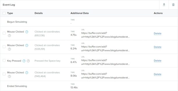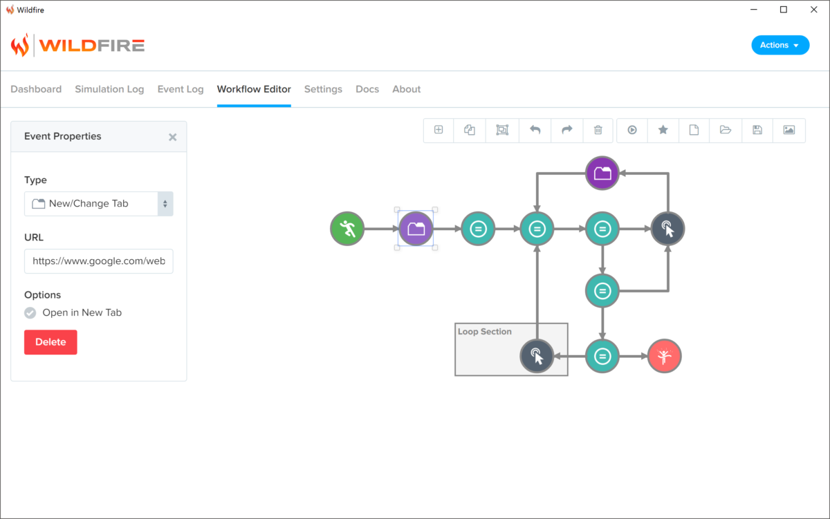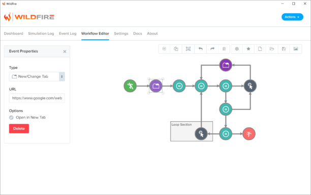 Toutes vos actions sont enregistrées dans un log que vous pouvez modifier. Wildfire contient un « workflow editor » qui vous permet d’éditer les actions enregistrées. Vous pouvez facilement modifier une URL saisie, ajouter ou supprimer des actions : clic, nouvel onglet, fermeture d’onglet, saisie de texte, ajout d’une variable, d’une fonction personnalisée, scroll, sélection de texte, copier/coller, import CSV…
