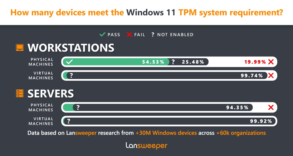 Ce n’est pas tout à fait une surprise, TPM n’a jamais été requis pour Windows et bien que le TPM passthrough (vTPM) existe pour donner un TPM aux machines virtuelles, il est rarement utilisé. Cela signifie que la plupart des postes de travail VM devront être modifiés pour obtenir un vTPM avant de pouvoir passer à Windows 11, analyse Lansweeper.