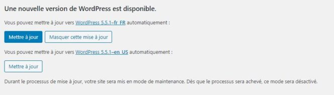 Vous pouvez également retrouver cette nouvelle mise à jour sur votre interface d’administration, dans la section Mises à jour de votre tableau de bord pour installer directement WordPress 5.5.1 sur votre site.