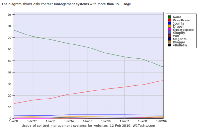 - Les autres CMS ne récoltent que les miettes de ce succès, le second sur le podium étant Joomla avec… 3% des parts de marché.