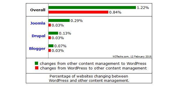 Néanmoins, relativement peu des sites ayant déjà un CMS en changent pour se diriger vers WordPress. En effet, 1,22% de l’ensemble de sites ayant migré de CMS l’ont fait vers WordPress depuis un autre CMS, et 0,84% des sites ont migré depuis WordPress vers un autre CMS.