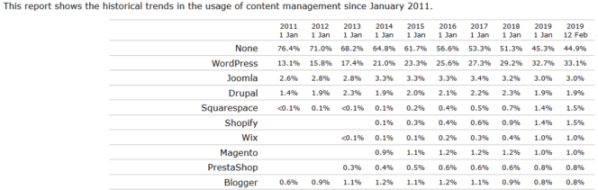 Dans son rapport du mois de janvier 2019, 629 CMS ont été intégrés dans l’analyse de W3Techs. Le site distingue trois données importantes :