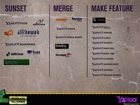 La nouvelle fait le tour de Twitter et du Web : Yahoo va fermer plusieurs de ses services, y compris Delicious. Le géant du Web d’autrefois confirme par cet événement se trouver dans une phase inéluctable de déclin. Le licenciement de plusieurs équipes entières va donc conduire à la suppression de certaines activités, la fusion de certaines, et l’intégration à d’autres services pour celles qui subsisteront. Si l’annonce n’a pas été officielle (il s’agit simplement de fuites), elle a été néanmoins confirmée par la suite sur le site de Techcrunch notamment. Sur l’image suivante, émanant d’une réunion de Yahoo, on voit quels services sont concernés : à gauche, les fermetures, au milieu, ceux qui vont fusionner, et à droite, ceux qui seront intégrés à d’autres services :