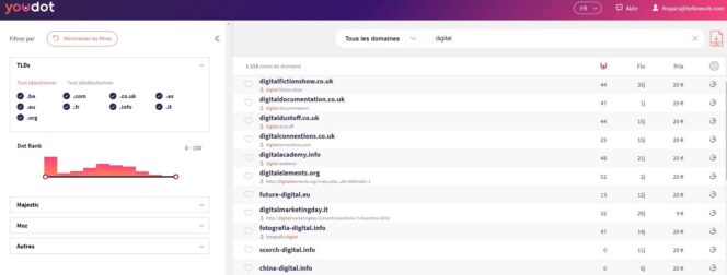 Pour trouver, et acheter un nom de domaine, il vous suffit de taper un mot clé, pour accéder à tous les domaines disponibles. Vous pouvez ensuite filtrer selon les extensions souhaitées, et les classer selon leur score « Dot Rank ». Il est possible de classer les résultats selon l’indicateur choisi (Trust flow de Majestic ou Moz Authority) afin de trouver le nom de domaine le plus pertinent pour vous.