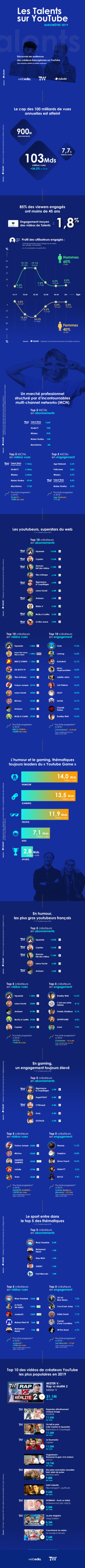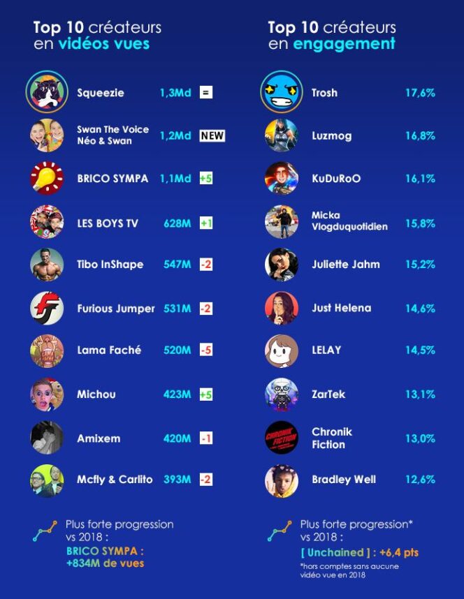 Squezie truste également le top 10 des créateurs en vidéos vues (1,3 milliard de VV), devant Swan The Voice Néo & Swan (1,2 milliard de VV) et Brico Sympa (1,1 milliard de VV). Du côté du classement des créateurs bénéficiant du plus fort engagement, le podium est constitué de : Trosh (17,6%), Luzmog (16,8%) et KuDuRoO (16,1%).