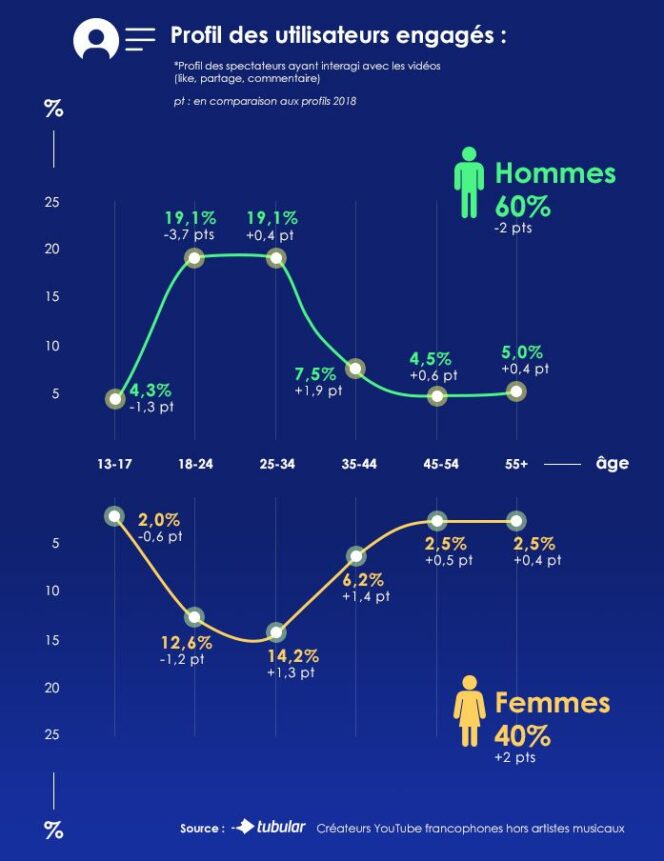 Si 85% des viewers engagés sur des vidéos de créateurs francophones ont moins de 45 ans, le profil type des utilisateurs est composé à 60% d’hommes âgés de 18 à 24 ans (19,1%, -3,7 pts) et de 25 à 34 ans (19,1%, +0,4pt).