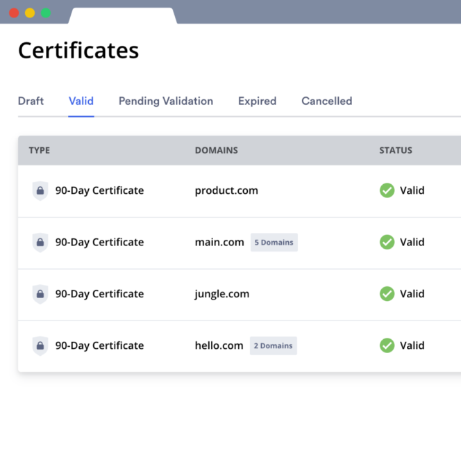 - Certificats de 90 jours : ils sont accessibles avec le plan gratuit, la validation ne prend que quelques minutes et l’installation est simple avec des instructions à chaque étape du processus.