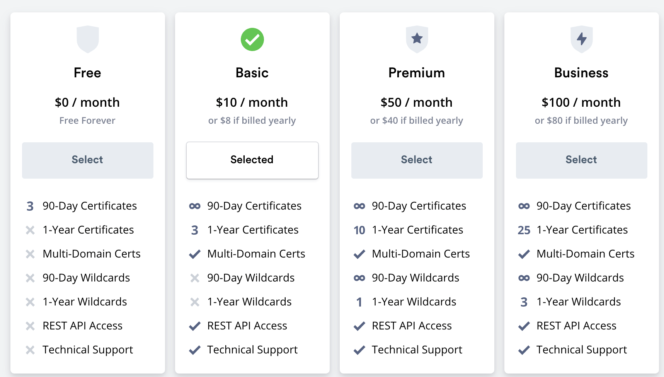 Le plan « Basic » à partir de 8$ / mois vous permet de créer des certificats illimités de 90 jours, 3 certificats d’un an et avoir un accès à l’API REST et au support technique.